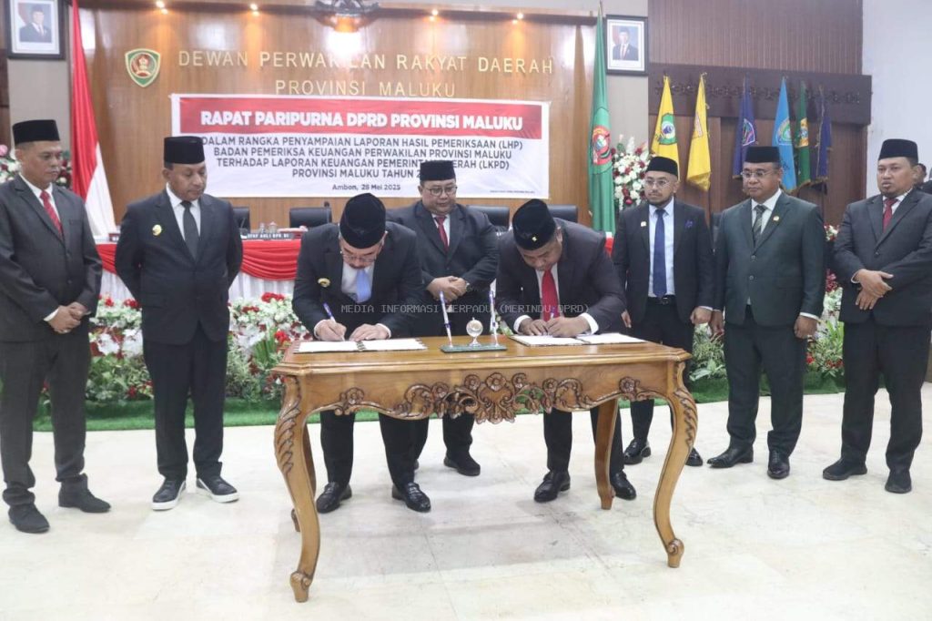 LHP diserahkan, saat rapat paripurna DPRD Provinsi Maluku, dalam rangka penyampaian LHP BPK RI atas LKPD Provinsi Maluku Tahun Anggaran 2024, yang berlangsung di ruang paripurna, Rabu (28/5/2025).