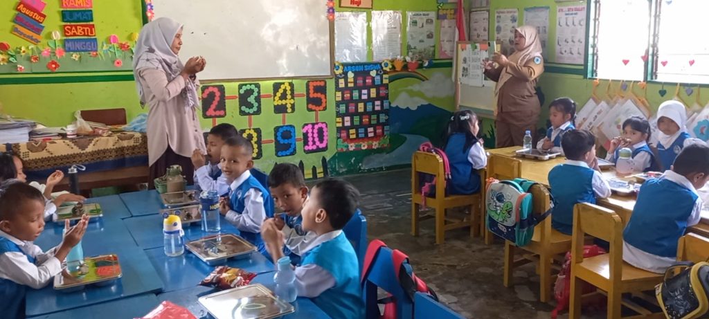 “Sedangkan air minum dibawa setiap anak dari rumah, setelah selesai wadah makan dan sendok dikembalikan agar bisa digunakan kembali di besok hari,” katanya.
