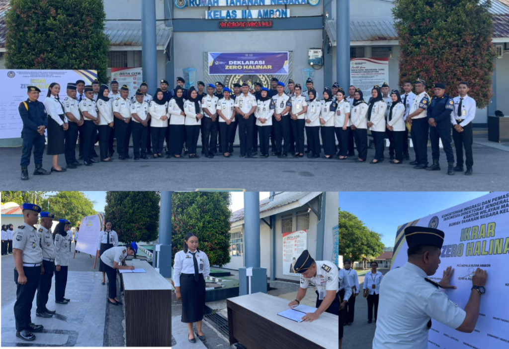 Ambon, BM.com– Rumah Tahanan Negara Kelas IIA Ambon meneguhkan komitmen bersama dalam mewujudkan lingkungan pemasyarakatan yang bersih, tertib, dan berintegritas melalui pelaksanaan penandatanganan Ikrar Zero HALINAR yang diikuti oleh seluruh jajaran pegawai, Senin (20/04). Kegiatan ini menjadi salah satu langkah nyata dalam memperkuat upaya pencegahan dan pemberantasan pelanggaran di lingkungan pemasyarakatan, khususnya yang berkaitan dengan handphone ilegal, pungutan liar, serta penyalahgunaan dan peredaran narkoba.